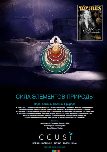 Para alcanzar una mayor visibilidad en el mercado ruso, Ccusi publicó un bonito anuncio en la prestigiosa revista Tot en Rus, publicación catalana orientada a los usuarios rusos. Para ello utilizamos nuestro anuncio Yaku, que presenta el elemento Ccusi de la temporada y que incluye una de las colecciones estrella de Ccusi, Culto al Agua.