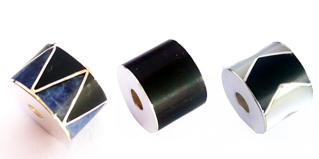 Todas ellas tienen una base de plata y ónix y se insertan en la pulsera a través de un orificio circular. Algunas de ellas contienen otras piedras o conchas como sodalita y spondylus. La fuerza de los elementos se representa en estas delicadas piezas.